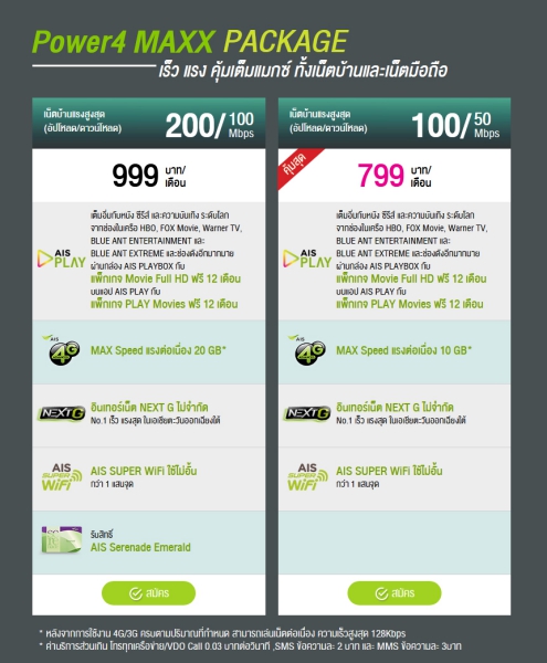 สอบถามข้อมูลเพิ่มเติมได้ที่ AIS Fibre Call Center 1175 หรือดูรายละเอียดเพิ่มเติมได้ที่ www.ais.co.th/fibre/package_power4maxx.html