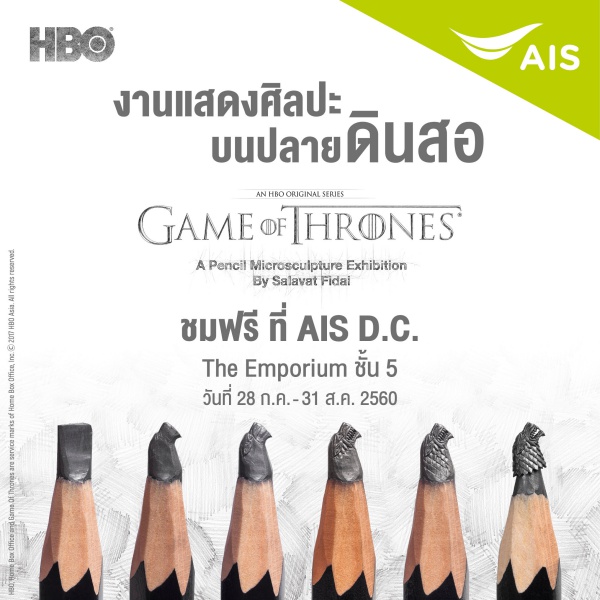 AIS จับมือ HBO ASIA นำสุดยอดงานศิลป์ระดับโลก “Game of Thrones A Pencil Microsculpture in Bangkok” (#GOTPencilArt) เป็นครั้งแรก และครั้งเดียวในเมืองไทย พบกับผลงานแกะสลักปลายดินสอขนาดจิ๋วเป็นรูปสัญลักษณ์ และตัวละครจากซีรีส์ Game of Thrones โดยศิลปินนักแกะสลัก Salavat Fidai ชาวรัสเซีย ซึ่งเดินทางไปจัดแสดงตามประเทศต่างๆ ทั่วโลก