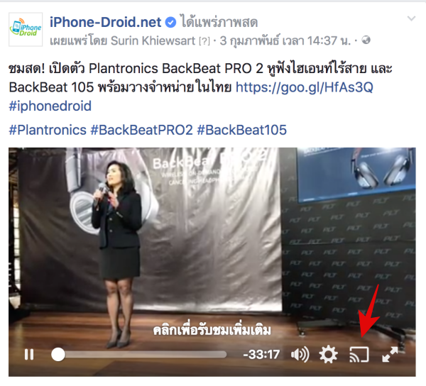 นอกจากจะใช้งานบนแอพต่างๆ บนสมาร์ทโฟนที่รองรับการแคสต์ขึ้นทีวี บน Mac, Windows, Chormbook ก็สามารถใช้งานได้ ตัวอย่างด้านล่างนี้สามารถแคสต์จาก Facebook Live ขึ้นไปดูบนทีวีได้ด้วยครับ สังเกตง่ายๆ ใช้งานแอพไหนแล้วมีเครื่องสัญลักษณ์การแคสจับโยนขึ้นไปบนทีวีได้หมดครับ