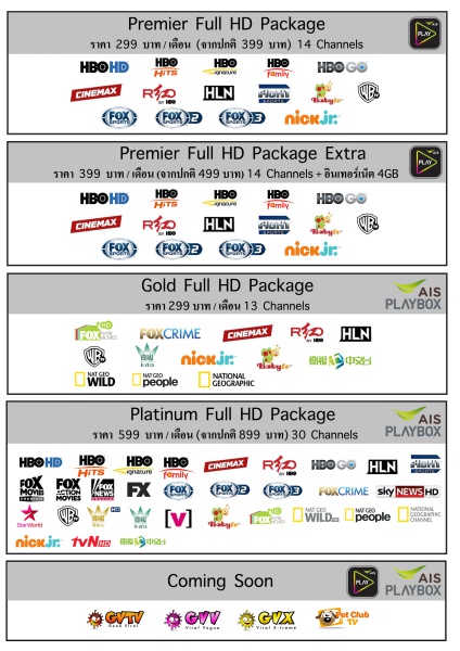 - Premier Full HD Package ราคาพิเศษ! เพียง 299 บาท/เดือน นาน 1 ปี (จากราคาปกติ 399 บาท/เดือน) เพียงสมัครตั้งแต่วันนี้ – 30 มิถุนายน 60 ได้รับชม14 ช่องดัง ประกอบด้วยภาพยนตร์ ซีรีส์ยอดฮิตจากทั้ง 6 ช่อง ของ HBO รวมถึง HBO GO และช่อง Warner TV, กีฬาจากช่อง FOX ทั้ง 3 ช่อง และ ช่อง FIGHT SPORTS, ข่าวจากช่องHLN, การ์ตูนจากช่อง Nick jr. และช่อง Baby tv สมัครใช้บริการกด *678# โทรออก หรือ www.ais.co.th/playapp