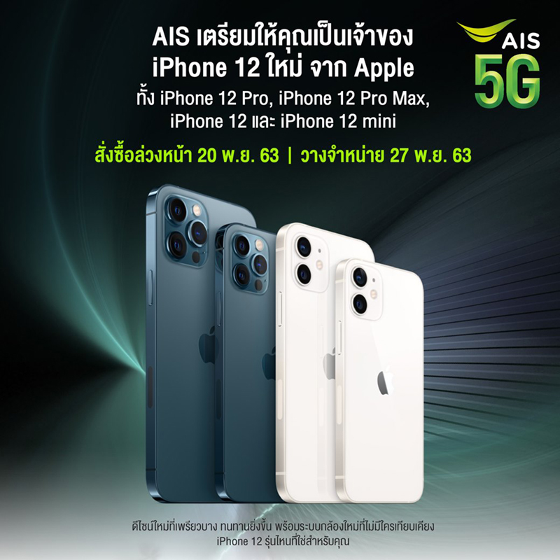 AIS ประกาศเตรียมเปิดพรีออเดอร์ iPhone 12 Pro, iPhone 12 Pro Max, iPhone 12 และ iPhone 12 mini พร้อมกันในวันที่ 20 พฤศจิกายน 63 และจะวางจำหน่ายอย่างเป็นทางการในวันที่ 27 พฤศจิกายน 63