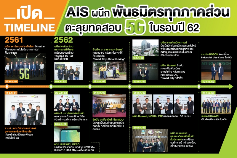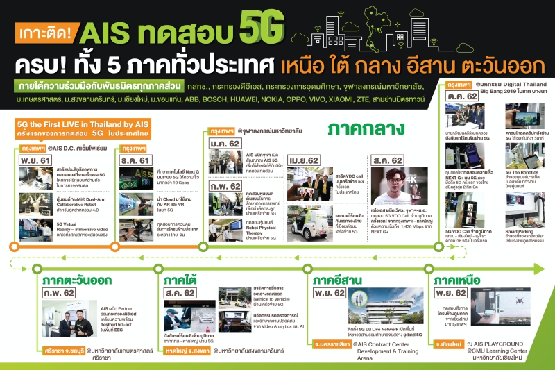 - ภาคกลาง : เปิดพื้นที่ AIS D.C. ศูนย์การค้า ดิ เอ็มโพเรียม จัดแสดงนวัตกรรม 5G Use Case เป็นครั้งแรกของเมืองไทย, ร่วมมือกับคณะวิศวกรรมศาสตร์ จุฬาลงกรณ์มหาวิทยาลัย เปิด 5G AI/IoT Innovation Center เพื่อเป็นพื้นที่ให้นักพัฒนาได้