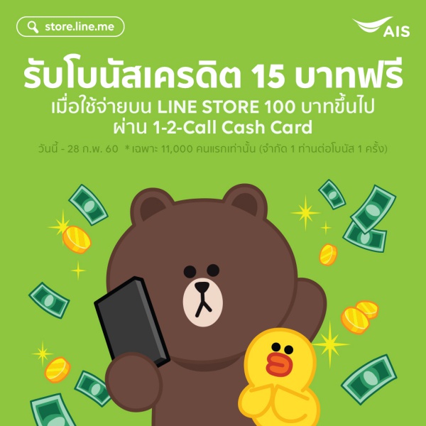 ลูกค้า AIS ระบบ เติมเงิน หรือลูกค้าที่ทำการเติมเครดิต เข้า Account Line Store ผ่านทางบัตรเงินสด วัน-ทู-คอล! ตั้งแต่ 100 บาท ได้รับโบนัส 15บาท โดยจำกัดการได้รับสิทธิ์ 1 LINE ID ต่อ 1 สิทธิ์ตลอดระยะเวลาโครงการ สำหรับลูกค้าที่ร่วมโครงการ 11,000 คนแรกเท่านั้น