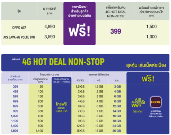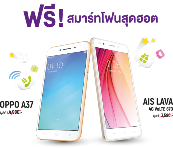 1. ฟรี! สมาร์ทโฟนสุดฮอต OPPO A37 เอาใจคนชอบถ่ายภาพ ถ่ายสวยด้วยกล้องหลัง 8MP กล้องหน้า 5MP หรือ AIS LAVA 4G VoLTE 870 รองรับการใช้งาน VoLTE บนเครือข่ายเอไอเอส 4G คุยชัด โทรติดเร็ว ถ้าอยากรับสมาร์ทโฟนฟรีให้เลือกเป็นโปรนี้ เงื่อนไขง่ายๆ เพียงแค่สมัครแพ็กเกจ 4G HOT DEAL NON-STOP เริ่มต้นเพียง 399 บาท เป็นโปรโมชั่นสุดคุ้ม มีให้ทั้ง ค่าโทร, เน็ต, AIS SUPER WIFI, หนังดี ซีรีย์ดังจาก HOOQ พร้อมชำระแพ็กเกจค่าบริการล่วงหน้า 1,500 บาท หรือ 1,000 บาท ระยะเวลาการใช้งาน 12 เดือน โดยแพ็กเกจค่าบริการล่วงหน้าจะถูกแบ่งเป็นส่วนลด ค่าบริการรายเดือน 10 เดือน เริ่มมีผลตั้งแต่รอบบิลที่ 2 เป็นต้นไปครับ