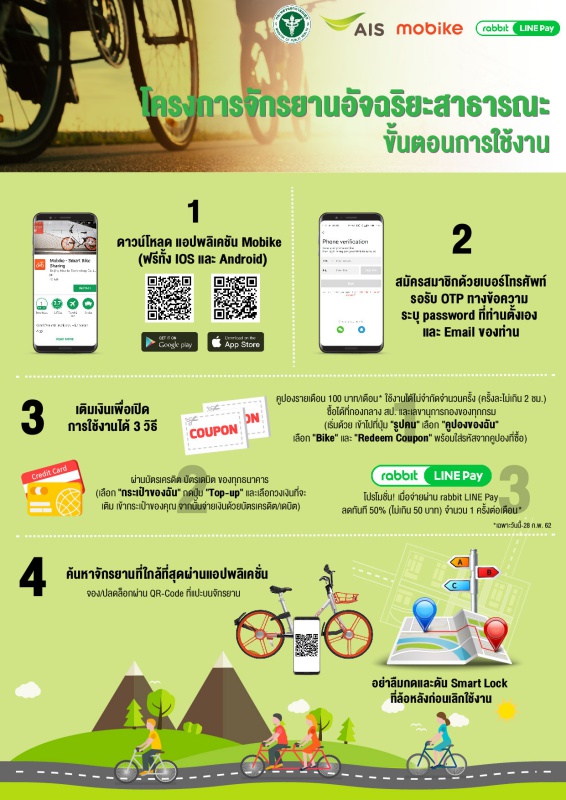 - ผ่าน Rabbit LINE Pay โปรโมชั่นพิเศษ! รับส่วนลด 50 % สูงสุด 50 บาทต่อคนต่อรายการต่อเดือน เมื่อชำระเงินค่าบริการรายเดือน Mobike pass หรือเติมเงินเข้ากระเป๋า Mobike ตั้งแต่ 50 บาทขึ้นไป ตั้งแต่วันนี้ – 28 กุมภาพันธ์ 2562