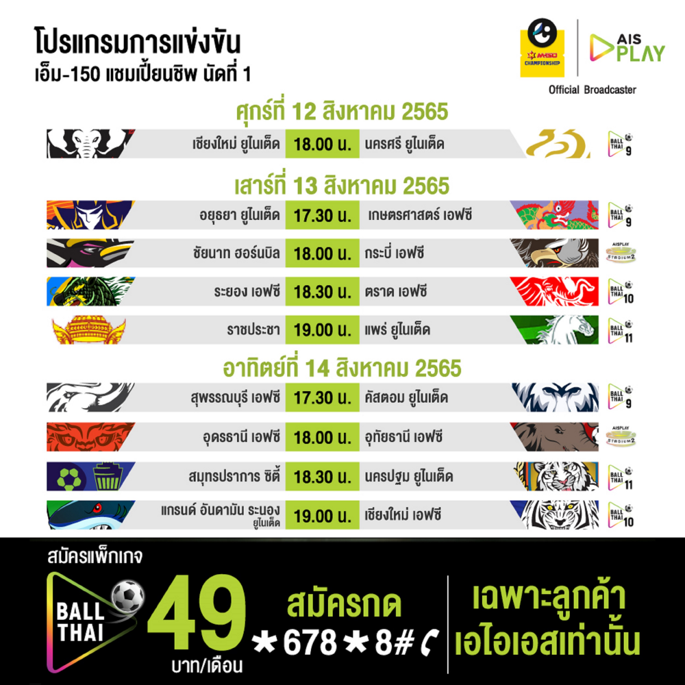 มาร่วมชมและเชียร์นักเตะที่ชื่นชอบรวมทั้งสโมสรที่รักในศึกฟุตบอลรีโว่ ไทยลีก ฤดูกาล 2022-2023 นี้ไปพร้อมกัน โดยนัดเปิดสนาม แบงค้อก ยูไนเต็ด จะเปิดบ้านต้อนรับการมาเยือนของขอนแก่น ยูไนเต็ด โดยเริ่มคิกออฟในเวลา 19.00 น. สำหรับคู่บิ๊กประจำสัปดาห์ นครราชสีมา เจอศึกหนักเมื่อต้องเปิดบ้านต้อนรับแชมป์เก่าอย่างบุรีรัมย์ ยูไนเต็ด โดยสามารถติดตาม ฟุตบอลรีโว่ ไทยลีก และ ฟุตบอล M-150 แชมเปี้ยนชิพ ในฤดูกาลใหม่นี้ผ่านทาง AIS PLAY ในทุกช่องทาง ทั้งแอปพลิเคชัน AIS PLAY, เว็บไซต์ ais.th/play/football , กล่อง AIS PLAYBOX, SAMSUNG Smart TV, Apple TV รวมทั้งสามารถเช็คตารางการถ่ายทอดสดการแข่งขันได้ที่ https://www.ais.th/play/football/matches/thaileague เพราะบอลไทย AIS PLAY เราคือที่ 1