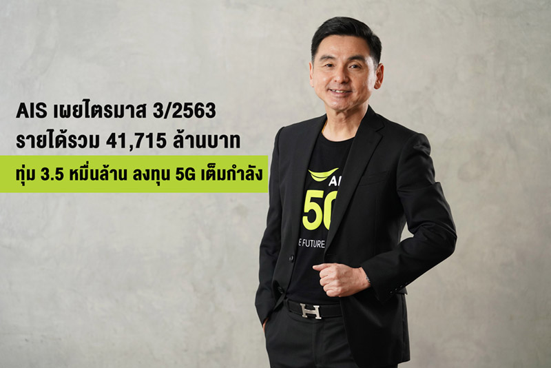 เอไอเอส เผยไตรมาส 3 ปี 63 รายได้รวม 41,715 ล้านบาทล็อคเป้า! ลงทุนขยายศักยภาพเครือข่าย 5G เพื่อคนไทยเต็มกำลังด้วยงบ 3.5 หมื่นล้านบาท ยึดการบริหารต้นทุนที่แข็งแกร่ง