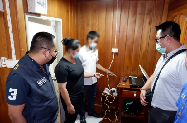 ดังนั้นกองบัญชาการตำรวจสืบสวนสอบสวนอาชญากรรมทางเทคโนโลยี ภายใต้การอำนวยการ พล.ต.ท.วรวัฒน์ วัฒน์นครบัญชา ผบช.สอท , พล.ต.ต.วิวัฒน์ คำชำนาญ รอง ผบช.สอท. สั่งการให้กองบังคับการตำรวจสืบสวนสอบสวน อาชญากรรมทางเทคโนโลยี 1 นำโดย พล.ต.ต.ชัชปัณฑการฑ์ คล้ายคลึง ผบก.สอท.1 สั่งการให้เจ้าหน้าที่ตำรวจสังกัด บก.สอท.1 กระจายกำลังลงพื้นที่ทำการสืบสวนจะกระทั่งสืบทราบว่ามีการใช้เครื่อง GSM Gateways (Simbox) ที่ บ้านเลขที่ 4/15 ม.8 ต.ตากแดด อ.เมืองชุมพร จ.ชุมพร ซึ่งเป็นห้องเช่าชั้นเดียวและพบสัญญาณที่บ้านพักเรือนไทย เลขที่ 75/2 หมู่ 6 ซอยศูนย์ราชการ5 ถนนเลียบทางรถไฟ ตำบลนาทุ่ง อำเภอเมืองชุมพร จังหวัดชุมพร ซึ่งเป็น ห้องพักให้เช่ารายเดือน จึงขออนุมัติหมายค้นศาลจังหวัดชุมพร เข้าทำการตรวจค้นบ้านเลขที่ดังกล่าวทั้ง 2 หลัง ดังกล่าว ผลการตรวจค้น พบนายสุจินดา(สงวนนามสกุล) และน.ส.วิภาวณี(สงวนนามสกุล) ซึ่งเป็นสามีภรรยากัน แสดงตัวเป็นผู้เช่าห้องพักดังกล่าว และเป็นผู้นำตรวจค้น รวมทั้งหมด 11 จุด ผลการตรวจค้น เบื้องต้นพบ GSM Gateways (Simbox) เครื่องแปลงสัญญาณโทรศัพท์แบบใส่ซิมการ์ด ระบบ IP-PBX จำนวน 38 เครื่อง, router wifi ชนิดใส่ซิมการ์ดได้ 19 เครื่อง เชิญตัว ผู้ครอบครองของกลางดังกล่าวทั้ง 2 ราย มาที่ สภ.เมืองชุมพร จากนั้นนำตัว พร้อมของกลางส่งพนักงานสอบสวน กก.2 บก.สอท.1 เพื่อดำเนินการต่อไป