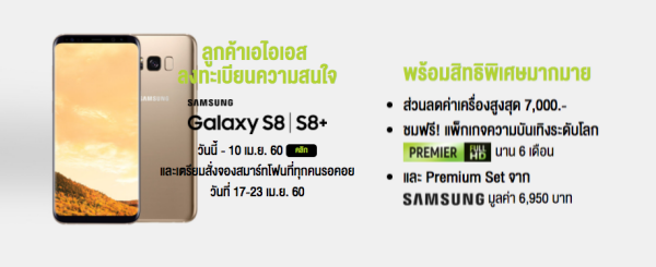 เอไอเอสเปิดให้จองสมาร์ทโฟนเรือธงแห่งปี “Samsung Galaxy S8/S8+” ก่อนใคร ตั้งแต่วันที่ 17 – 23 เม.ย. 2560 ผ่านทาง www.galaxyunboxyourphone.com/pre-order/ais ที่มาพร้อมข้อเสนอพิเศษที่สุดเท่าที่เคยมีมาโดยมอบส่วนลดค่าเครื่องสูงสุด 7,000 บาท พร้อมมอบความบันเทิงระดับโลก ให้ชมฟรี! แพ็กเกจ Premier Full HD นาน 6 เดือน มูลค่า 2,562 บาท และรับฟรี! พรีเมี่ยมเซตจากซัมซุง มูลค่า 6,950 บาท สำหรับลูกค้าเอไอเอส ทั้งลูกค้าปัจจุบัน, เปิดเบอร์ใหม่, ย้ายค่ายเบอร์เดิม หรือเปลี่ยนจากเติมเงินเป็นรายเดือน เมื่อสมัครแพ็กเกจ AIS 4G Hot Deal เริ่มต้นเพียง 899 บาท/เดือน พิเศษยิ่งกว่า! สำหรับลูกค้าเซเรเนดได้รับเพิ่ม Google Chromecast มูลค่า 1,650 บาท (จำนวนจำกัด)