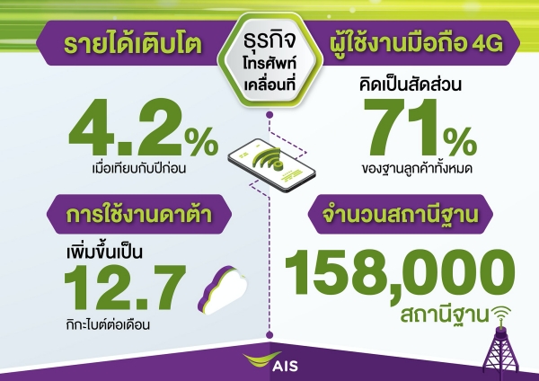 สำหรับธุรกิจโทรศัพท์เคลื่อนที่ เติบโต 4.2% เทียบกับปีก่อน ทำให้เอไอเอสยังครองส่วนแบ่งการ