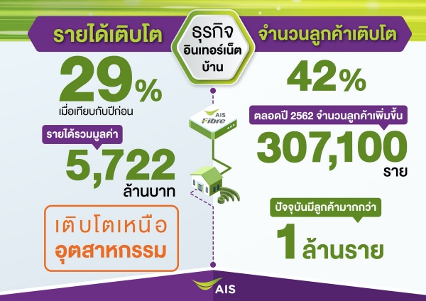 ขณะที่ ธุรกิจอินเทอร์เน็ตบ้าน เอไอเอส ไฟเบอร์ ยังคงเติบโตเหนืออุตสาหกรรม ตลอดทั้งปี 2562 มีลูกค้าเพิ่มขึ้น 42% หรือกว่า 307,100 ราย จากปี 2562 ส่งผลให้ปัจจุบันมีลูกค้ามากกว่