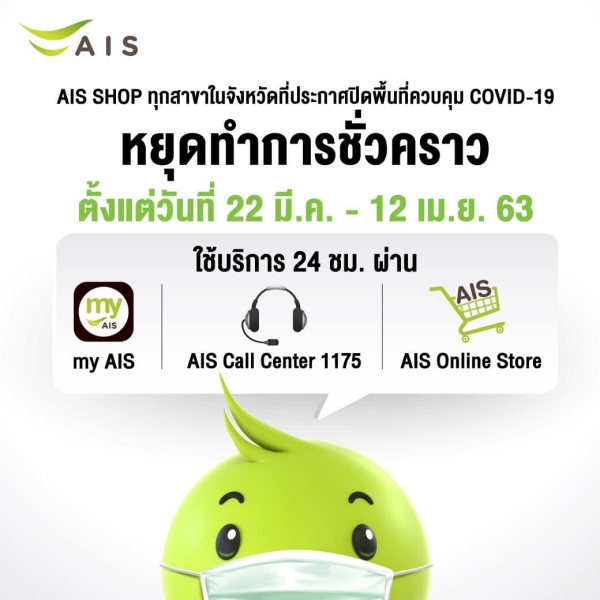 ตามที่ กรุงเทพมหานคร และกระทรวงมหาดไทย ได้ออกประกาศปิดสถานที่ต่างๆ ในพื้นที่กรุงเทพฯ และปริมณฑล รวม 26 ประเภท ตั้งแต่วันที่ 22 มีนาคม 2563 ถึง 12 เมษายน 2563 เอไอเอส ดำเนินการปฏิบัติตามประกาศอย่างเคร่งครัดในทันที จึงได้ประกาศหยุดทำการชั่วคราว ทั้ง AIS Shop, Serenade Club และ AIS Telewiz ทุกสาขาในพื้นที่ซึ่งมีการประกาศปิดพื้นที่ เพื่อควบคุมสถานการณ์แพร่ระบาดของเชื้อไวรัส COVID-19 ตั้งแต่วันที่ 22 มีนาคม 2563 – 12 เมษายน 2563 ทั้งนี้ ลูกค้าทุกท่าน ยังสามารถใช้บริการผ่านช่องทางออนไลน์ ได้แก่• my AIS appให้บริการเช็กยอดค่าใช้จ่าย, เติมเงิน, จ่ายบิล, ซื้อแพ็กเกจเสริมได้ 24 ชั่วโมง