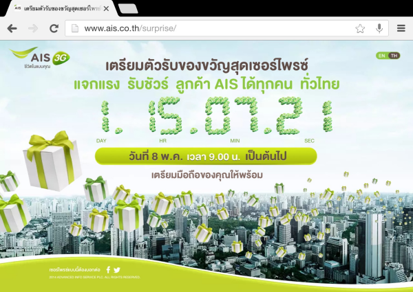 AIS จัดแคมเปญใหญ่สำหรับลูกค้า AIS ทุกคนครับ เซอร์ไพรส์ที่ว่านี้ยังไม่ทราบว่าเป็นอะไรแต่ทาง AIS กระซิบบอกมาว่าขอแค่มีเบอร์ของ AIS เท่านั้นจะเป็นลูกค้าเก่าหรือใหม่ได้รับเซอร์ไพรส์นี้เหมือนกันหมดครับ