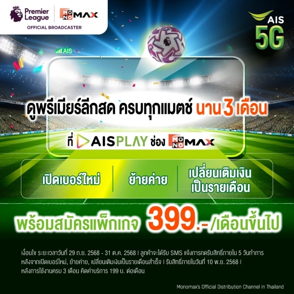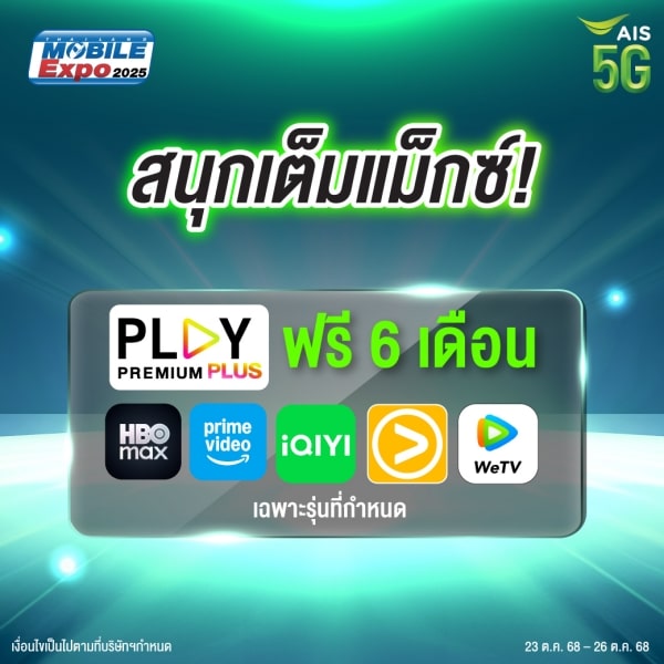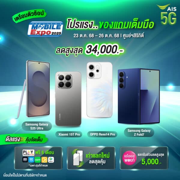 เอไอเอส ตอกย้ำการเป็นศูนย์รวมด้านดิจิทัลไลฟ์สไตล์แบบครบวงจร เติมเต็มทุกประสบการณ์ด้วยสมาร์ทโฟนและไลฟ์สไตล์ดิจิทัล พร้อมส่งมอบทุกโซลูชันส์ และความสุขส่งท้ายปี 2025 อย่างยิ่งใหญ่ ด้วยแคมเปญโปรโมชั่นสุดร้อนแรงแห่งปี ในงานมหกรรมมือถือที่ใหญ่ที่สุดในประเทศ Thailand Mobile Expo 2025 ที่จัดขึ้นระหว่างวันที่ 23 – 26 ตุลาคม 2568 ณ บูธ PL10 ศูนย์การประชุมแห่งชาติสิริกิติ์ จัดเต็มกว่าที่เคย ดีลสมาร์ทโฟนตัวท็อป อาทิ iPhone, Samsung, Xiaomi และ OPPO ลดแรงที่สุดแห่งปีสูงสุด 34,000 บาท และเนื่องในโอกาสฉลอง 35 ปี ขอมอบความว้าว เพียงใช้ AIS Points 1 คะแนน แลกรับส่วนลด 200 บาท สำหรับซื้อสินค้ากลุ่ม Gadget หรือ Accessories มูลค่า 2,000 บาท ต่อใบเสร็จพร้อมเปิดตัวฟีเจอร์ใหม่กล้องอัจฉริยะ AiCAM และดีไวซ์สุดล้ำระดับเทพและมากกว่าการซื้อสมาร์ทโฟน ลูกค้ายังได้รับสิทธิพิเศษชมความบันเทิงฟรี! ด้วย Entertainment Platform อย่าง AIS PLAY ที่รวมที่สุดแห่งความบันเทิงและกีฬา ดูพรีเมียร์ลีกสด ครบทุกแมตช์ นาน 3 เดือน และ Play Premium Plus สนุกเต็มแมกซ์ กับ 5 แอปดัง นาน 6 เดือน* เฉพาะรุ่นที่กำหนด เติมเต็มทั้งสมาร์ทโฟนและไลฟ์สไตล์ในแพ็กเกจเดียว พร้อมของแถมจัดเต็ม
