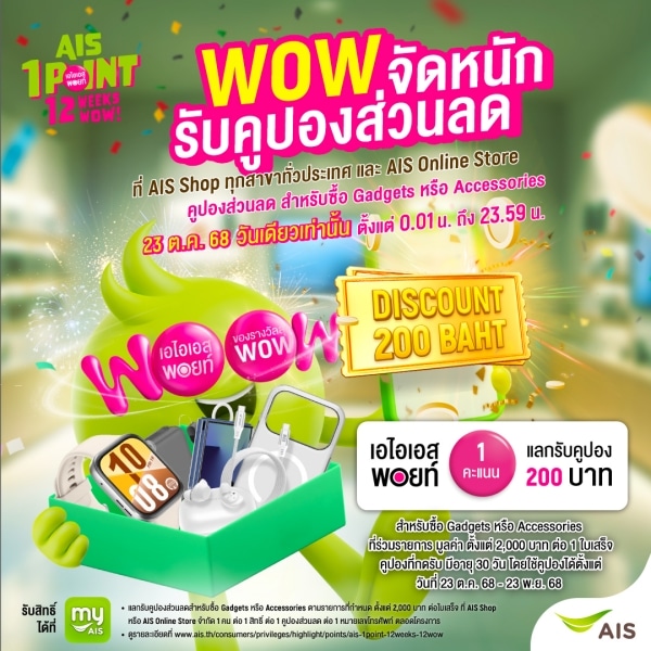 นอกจากนี้ ในโอกาสครบรอบ 35 ปี เอไอเอสขอแทนคำขอบคุณลูกค้า มอบสิทธิพิเศษผ่านแคมเปญสุดยิ่งใหญ่ “AIS 1 POINT 12 WEEKS 12 WOW” ที่แจกใหญ่ไม่มีหยุด โดยว้าวนี้เอาใจสาย Gadget และ Accessories โดยเฉพาะ เพียงใช้ AIS Points 1 คะแนน* แลกรับฟรี! ส่วนลด 200 บาท สำหรับซื้อสินค้ากลุ่ม Gadget หรือ Accessories มูลค่า 2,000 บาท ต่อใบเสร็จ (*เฉพาะสินค้าที่ร่วมรายการ) กดรับสิทธิ์ได้ในวันที่ 23 ตุลาคม 2568 วันเดียว ผ่านแอป myAIS เท่านั้น พิเศษ! สามารถใช้สิทธิ์ได้ในงาน Thailand Mobile Expo 2025 รวมถึง AIS Shop ทุกสาขา และ AIS Online Store จนถึงวันที่ 23 พ.ย. 68 สามารถดูรายละเอียดเพิ่มเติมได้ที่ https://www.ais.th/consumers/privileges/highlight/points/ais-1point-12weeks-12wow