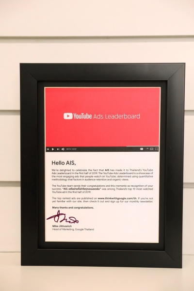 โดย นายฮุย เว็ง ชอง กรรมการผู้อำนวยการ บริษัท แอดวานซ์ อินโฟร์ เซอร์วิส จำกัด (มหาชน) พร้อมด้วยคณะผู้บริหาร ร่วมรับมอบรางวัล No.1 YouTube Ads Leaderboard H1 2019 จาก แคมเปญ AIS X LISA ในฐานะผลงานโฆษณาที่ได้รับความนิยมมากที่สุดในครึ่งปีแรก ของปี 2562โดย YouTube ซึ่ง นายไมเคิล จิตติวาณิชย์ หัวหน้าฝ่ายการตลาด บริษัท กูเกิล ประเทศไทย เป็นตัวแทนมอบให้