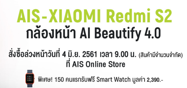 AIS เตรียมเปิดจอง “AIS – XIAOMI Redmi S2” สุดยอดสมาร์ทโฟน เทคโนโลยีอัจฉริยะ กล้องหน้า 16 MP พร้อม AI Beautify 4.0 เซลฟี่ขั้นเทพ ที่ใครๆ ก็เป็นเจ้าของได้ ปรับหน้าเป๊ะได้ดั่งใจ และกล้องหลังคู่ (Dual Camera) 12 MP+5 MP พร้อม AI Portrait ให้ภาพหน้าชัดหลังเบลอ พร้อมหน้าจอใหญ่ FullView Display ขนาด 5.99 นิ้ว และ Qualcomm Snapdragon 625 ใช้งานเล่นเกมส์ลื่นไม่สะดุด รองรับ 2 SIM 4G ถึง 2 ช่องและ 1 Micro SD Card ในราคาที่คุ้มค่าที่สุดเท่าที่เคยมีมา พร้อมรองรับเครือข่าย AIS Next G และ AIS IoT เพื่อส่งมอบสุดยอดประสบการณ์ใช้งานแบบเร็ว แรง ที่สุดในเอเชียตะวันออกเฉียงใต้ ให้คอไฮเทคชาวไทยที่เลือกใช้เสียวหมี่ “Xiaomi Redmi S2” ซึ่งเป็นรุ่นที่เอ็กซ์คลูซีฟขายที่เอไอเอสเท่านั้น