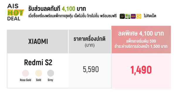 พร้อมจัดเต็ม! ข้อเสนอสุดพิเศษ สำหรับลูกค้าเอไอเอส รายเดือน ที่เปิดเบอร์ใหม่ หรือย้ายค่ายเบอร์เดิม หรือเปลี่ยนจากเติมเงินเป็นรายเดือน และลูกค้าปัจจุบัน ราคาพิเศษเพียง 1,490 บาท จากราคาปกติ 5,590 บาท (รับส่วนลดค่าเครื่อง 4,100 บาท) เมื่อชำระค่าบริการล่วงหน้า 1,500 บาท พร้อมสมัครแพ็กเกจ AIS HOT DEAL 599 บาทขึ้นไป (ของมีจำนวนจำกัด) และรับฟรี! ชมคอนเทนต์บันเทิงระดับโลกผ่านแอป AIS PLAY กับแพ็กเกจ Premier Full HD , VIU และ HOOQ นาน 3 เดือน (มูลค่ารวม 1,851 บาท)
