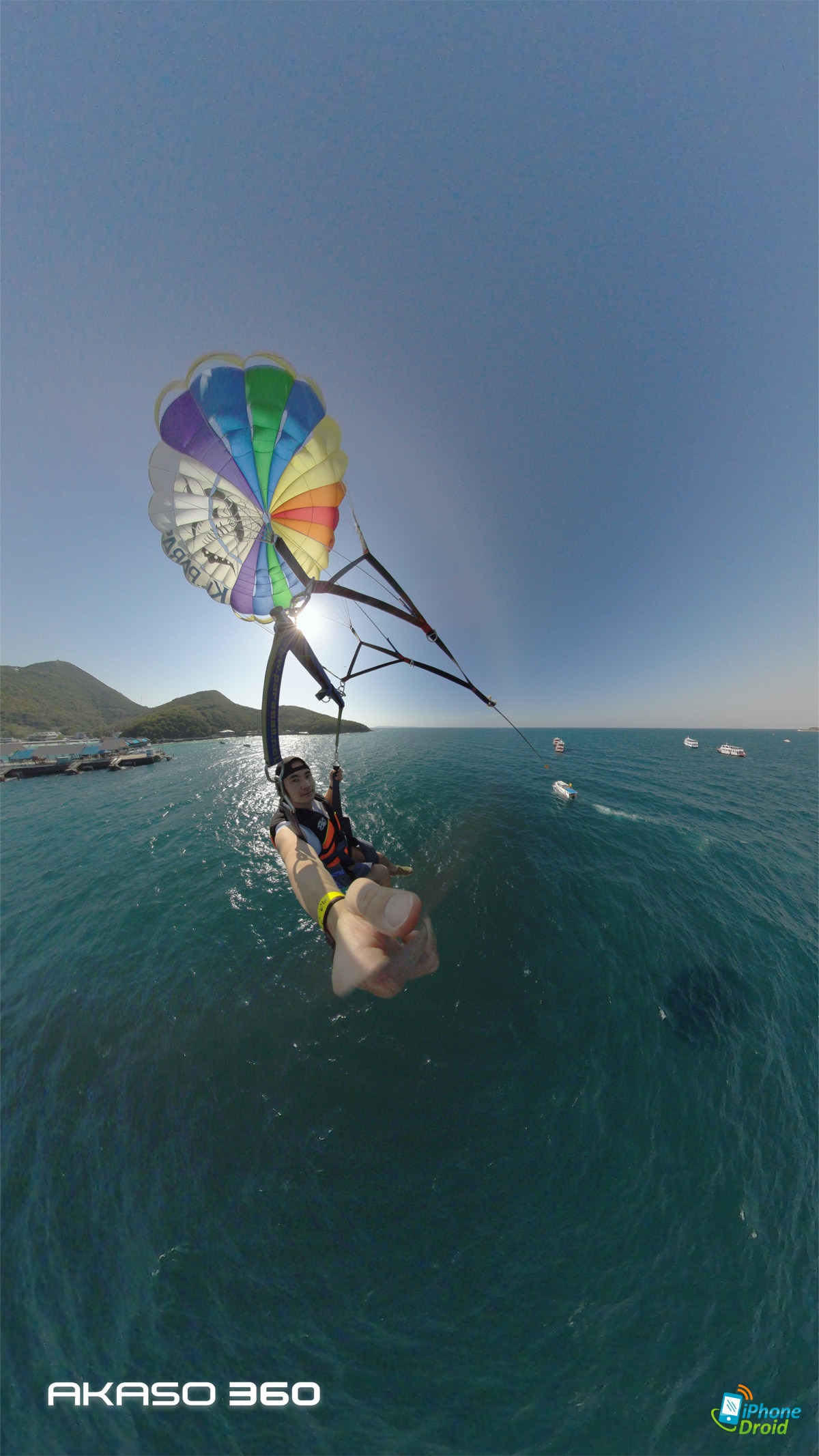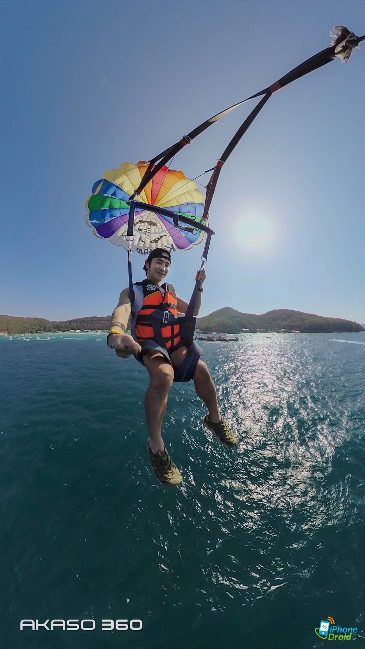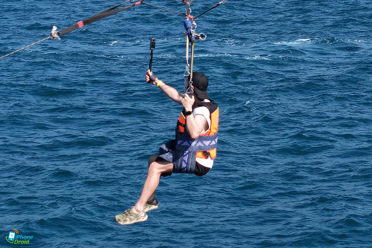 มาถึงจุดพีคของวันคือการเล่นกิจกรรม Adventure ทางน้ำอย่างพาราเซลลิ่ง (Parasailing) ที่ให้เราได้ใช้ทั้งการถ่ายในโหมด 360 องศาปกติ เห็นทั้งน้ำทะเล ท้องฟ้า และตัวเราที่บินแบบเท่ๆ อยู่ตรงกลาง และเป็นช็อตที่เหมาะมากกับการถ่ายกิจกรรมผจญจัยต่างๆ ด้วย