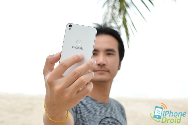 ถัดมาตรงกลางเครื่องจะมีเซ็นเซอร์สแกนลายนิ้วมือ และโลโก้แบรนด์ alcatel ส่วนฝาหลังนั้นไม่สามารถแกะเปิดเองได้ โดยภายในมีแบตเตอรี่ขนาด 2,460 mAh