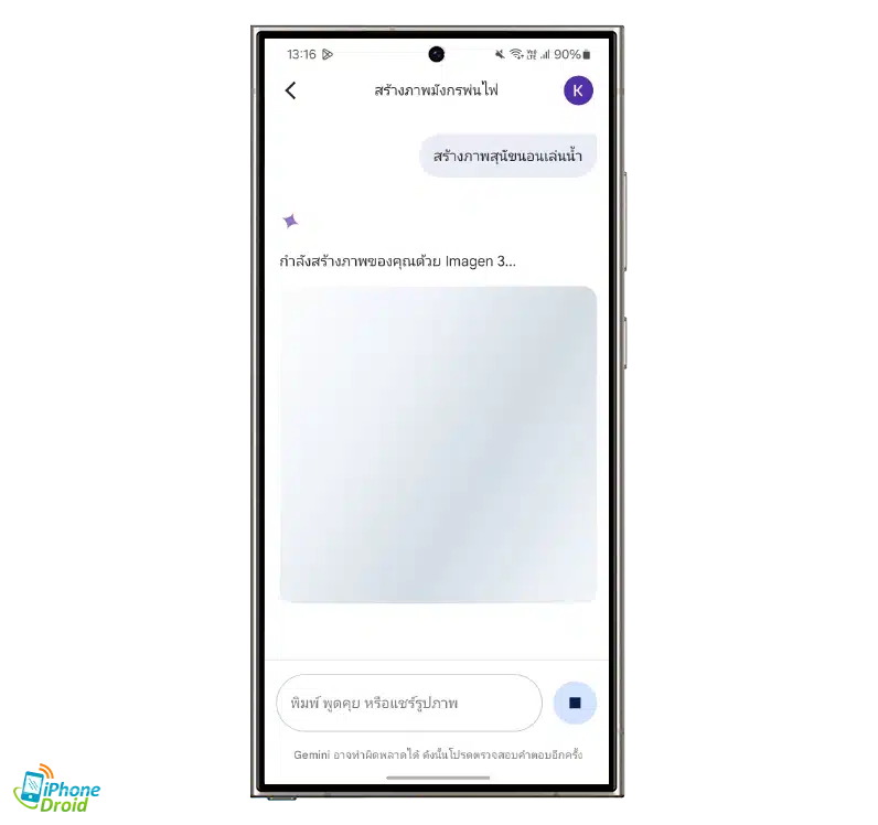 ตอนนี้ผู้ใช้งานทั่วโลก (รวมถึงไทย) ก็สามารถพิมพ์คำสั่งลงในแอป Gemini ได้เลย ซึ่งเมื่อได้รับคำสั่งแล้ว ก็จะมีการสร้างภาพที่ระบุข้อวความว่า “กำลังสร้างภาพของคุณด้วย Imagen 3” และเมื่อได้ภาพออกมาแล้ว เราสามารถดาวน์โหลดออกมาได้ โดยติดลายน้ำ SynthID ครับ