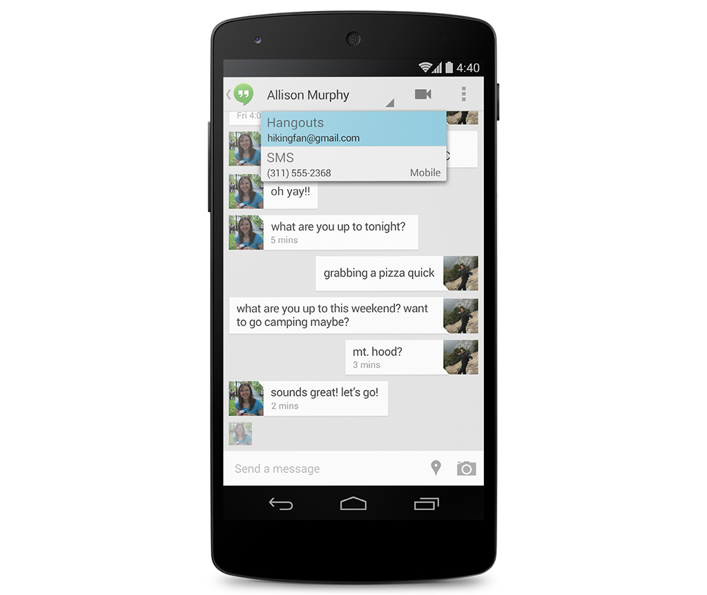 Google รวมเอาแอพ Hangouts IM มาให้บริการรับส่งข้อความ SMS และ MMS ที่รวมประวัติสนทนาไว้กับรายชื่อติดต่อ นอกจากนี้ยังสามารถส่งไฟล์ภาพ GIF และแชทผ่านวิดีโอได้ด้วย