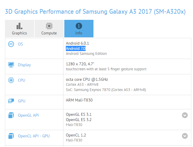 พบข้อมูล Samsung Galaxy A3 (2017) รันระบบปฏิบัติการ Android 7.0 Nougat บนฐานข้อมูลของ GFXBench คาดจะได้อัปเกรดในเร็ว ๆ นี้