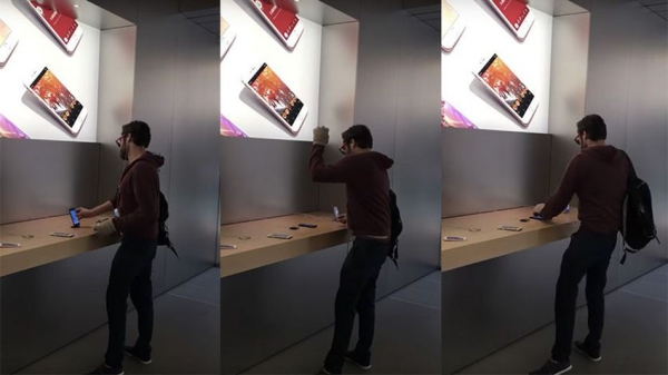 มีรายงานว่า มีชายสวมเสื้อด้านในสีชมพูแล้วคลุมด้วยเสื้อแขนยาวสีแดง มือข้างซ้ายสวมถึงมือพร้อมกับลูกเหล็กที่มีลักษณะกลมอยู่ในมือด้วย เดินเข้าไปในร้านแล้วจับ iPhone และ MacBook ที่วางแสดงอยู่ในร้าน ทุบด้วยลูกเหล็กทีละเครื่อง ท่ามกลางความงุนงงของลูกค้าและพนักงานในร้าน Apple Store