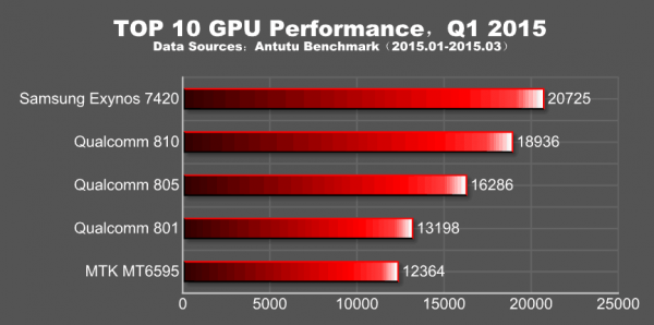 Samsung Galaxy S6 ใช้ชิปเซ็ต Exynos 7420 ทำคะแนนทิ้งห่างชิปเซ็ต Qualcomm Snapdragon 810 ที่อยู่บน HTC One M9 จุดน่าสนใจอย่างหนึ่งคือ Galaxy S6 edge ตามหลังอยู่เพียงไม่กี่คะแนนซึ่งอยู่อันดับ 2 ในขณะที่ Galaxy S5 Plus รุ่นชิปเซ็ต Snapdragon 805 ก็ทำคะแนนตามมาอยู่อันดับที่ 4 ของตาราง