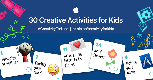 30 กิจกรรมสุดสร้างสรรค์สำหรับเด็ ก ที่จะช่วยให้เด็กรู้จักคิดนอกกรอบ รู้จักสังเกตและเพิ่มประสบการณ์ การเรียนรู้ใหม่ ใช้เวลาและเทคโนโลยีให้เกิ ดประโยชน์มากขึ้นผ่านการใช้ งานคุณสมบัติต่างๆ บน iPad หรือ iPhone โดยกิจกรรมเหล่านี้ เด็กๆ สามารถเรียนรู้และทดลองทำได้ด้ วยตัวเอง หรือจะสนุกพร้อมกันทั้งครอบครั วก็ได้ อาทิ การบันทึกวิดีโอไทม์แลปส์ ขณะทำของว่างจานโปรด หรือสังเกตน้ำแข็งที่ค่ อยๆละลาย, เรียนรู้เรื่องรูปทรงผ่านการถ่ ายภาพและใช้คุณสมบัติ “ทำเครื่องหมาย” เพื่อลอกลายรูปทรงทั้งหมดที่คุ ณหาเจอ หรือทายปริศนาผ่านอิโมจิ ฯลฯ