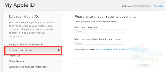 ให้เข้าไปที่ My Apple ID จากนั้นเลือกไปที่ Manage your Apple ID ให้ล็อคอินด้วย Apple ID และ Password ของเราได้เลยครับ และให้เลือกไปที่หัวข้อ Password and Security ให้ตอบคำถามความปลอดภัยทั้ง 2 ข้อที่เราเคยตั้งไว้ครับ ในกรณีที่ลืมคำตอบให้รีเซ็ตรหัสผ่านใหม่จะเห็นได้จากด้านล่างที่เขียนว่า Forgot your answers