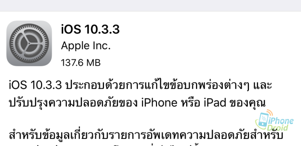 หลังจากที่ก่อนหน้านี้แอปเปิลได้ออก iOS 10.3.3 เบต้า มาให้ได้ทดสอบการทำงานและข้อบกพร่องต่างๆ ล่าสุดแอปเปิลได้ปล่อยเวอร์ชั่นเต็มออกมาให้ติดตั้งแล้วครับ