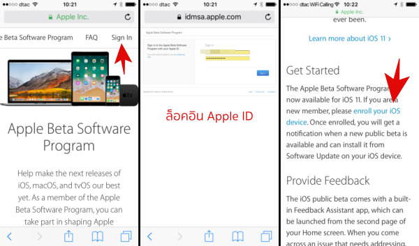 1.เข้าไปที่ https://beta.apple.com/sp/betaprogram/ บน iPhone, iPod, iPad ผ่าน Safari เท่านั้น ไปที่ Sign In และล็อคอินด้วย Apple ID, iCloud ที่ใช้งานอยู่ ล็อคอินได้แล้วเลื่อนหา “enroll your iOS device”