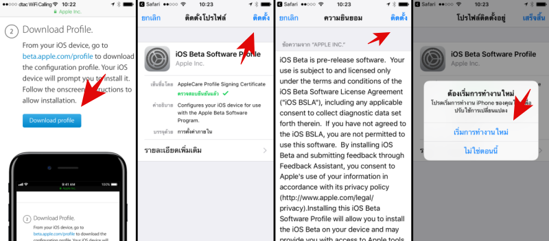 จากนั้นเข้าไปที่ “Download profile” Install > Install > Done เครื่องจะให้ Restart 1 ครั้ง