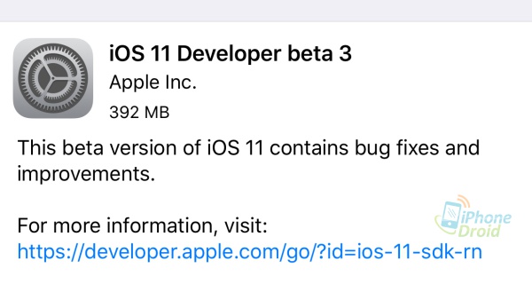 iOS 11 beta 3 บน iPhone 7 Plus ไฟล์ขนาด 392MB. โดยในเวอร์ชั่นนี้ได้แก้บั๊ก ปรับปรุงการทำงานต่างๆ ให้ดีมากยิ่งขึ้น ผู้ท่ีติดตั้ง iOS 11 beta 2 เวอร์ชั่นสำหรับนักพัฒนาไว้ก่อนหน้านี้เข้าไปติดตั้งได้ที่ Settings > General > Software Update เชื่อมต่อ Wi-Fi ดาวน์โหลดและติดตั้ง