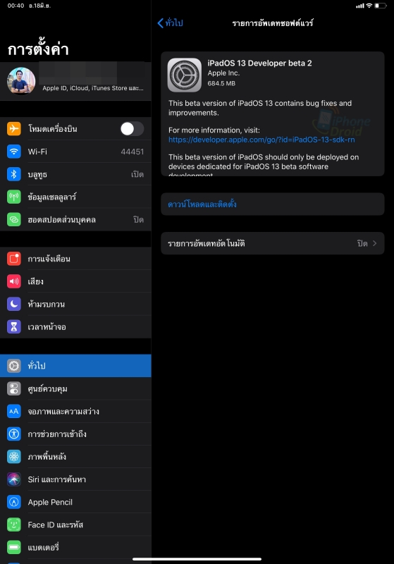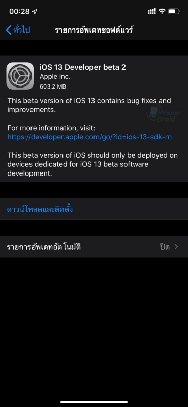 การอัพเดท iOS 13 และ iPadOS Beta 2 สำหรับนักพัฒนาหากติดตั้งเบต้าแรกไว้แล้วให้เข้าไปที่ Settings > General > Software Update เชื่อมต่อ Wi-Fi ดาวน์โหลดและติดตั้ง