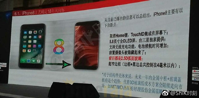 เผยภาพ iPhone รุ่นใหม่หรือ iPhone 8 อยู่ในสไลด์นำเสนอภายในงานประชุมมือถือที่จัดขึ้นในเมืองเซินเจิ้นของจีน มาพร้อมหน้าจอ OLED แทบจะไร้กรอบหน้าจอ