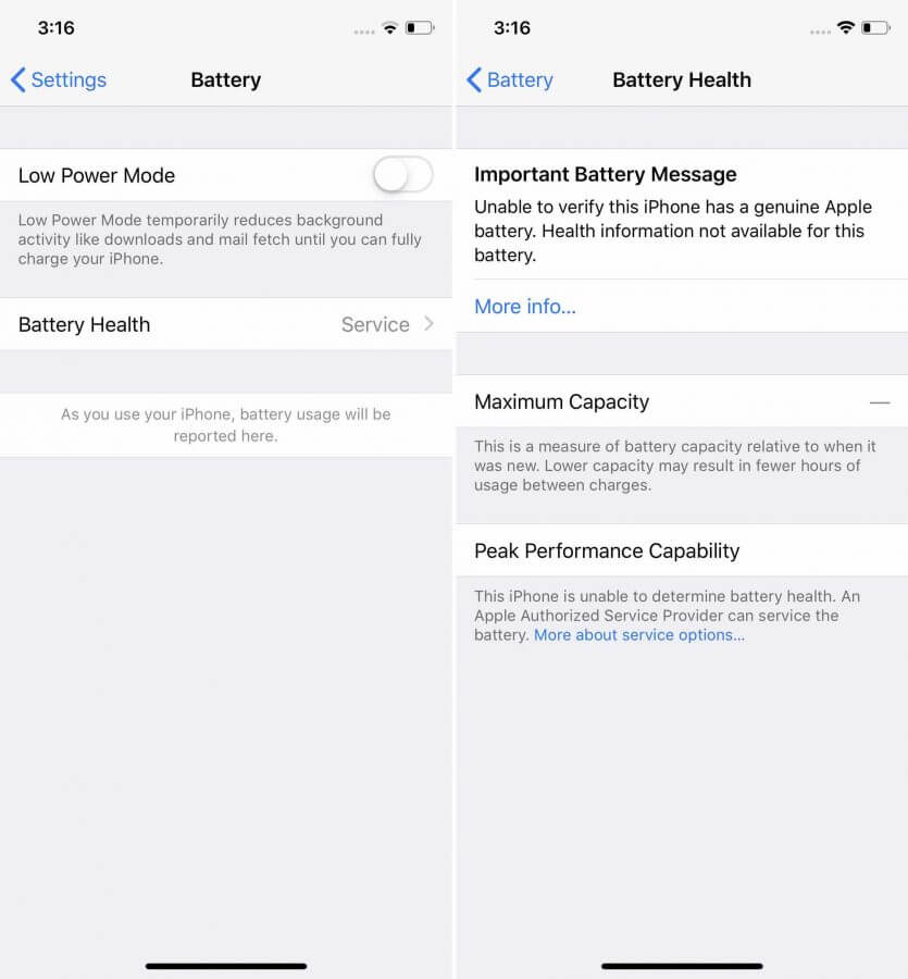Apple บล็อกการดูข้อมูลสุขภาพแบตเตอรี่ที่เปลี่ยนจากร้านภายนอกที่ไม่ได้รับรองมาตรฐานจาก Apple โดยขึ้นข้อความว่า Service หรือ บริการ เพื่อให้ผู้ใช้งานนำเครื่องไปเปลี่ยนแบตจากศูนย์บริการมาตรฐานของ Apple