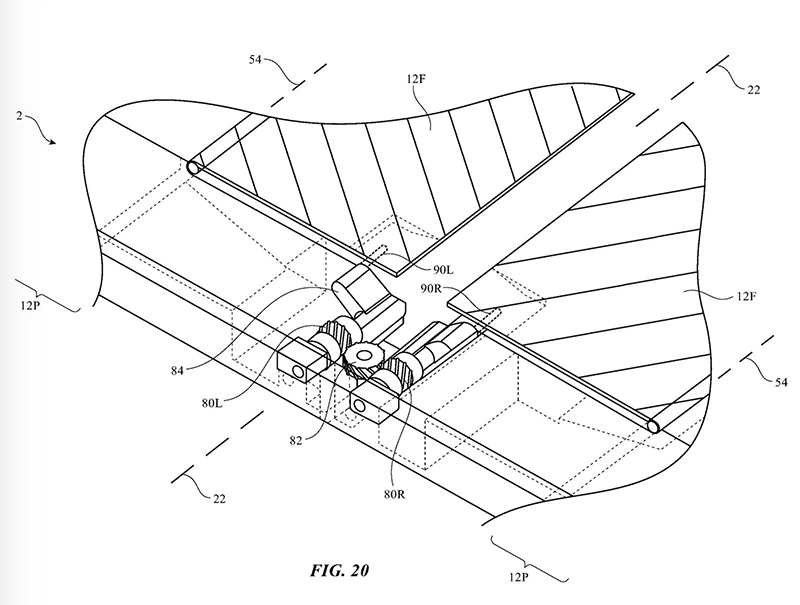 สิทธิบัตรดังกล่าวได้จดผ่านสำนักงานทรัพย์สินทางปัญญาสหรัฐ (U.S. Patent and Trademark Office : USPTO) โดยอธิบายว่ากลไกการพับนั้นมีการแยกเป็น 2 ส่วนอย่างชัดเจน เมื่ออุปกรณ์กางออก ตัวบานพับก็จะขยายออกเพื่อปิดช่องว่างที่เหลือ และเมื่อทำการพับ ตัวบานพับก็จะขยับถอยลงมาด้วย
