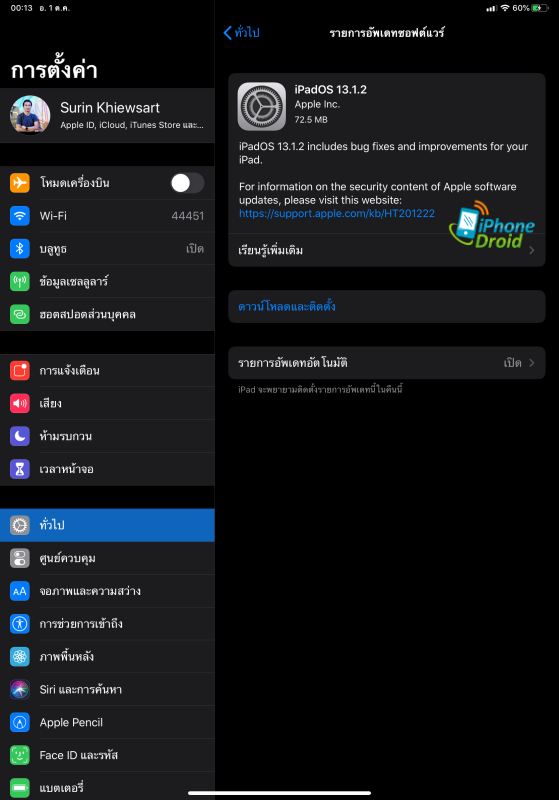 ความเปลี่ยนแปลงในเวอร์ชั่น iOS 13.1.2 บน iPad ดังนี้