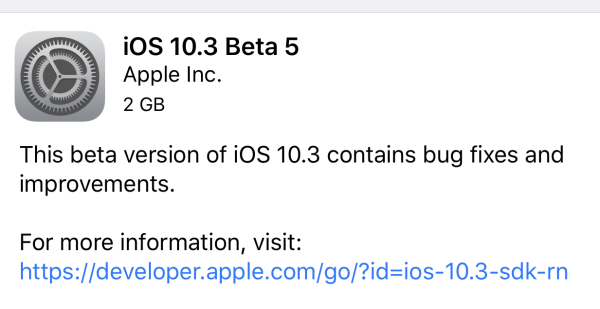 iOS 10.3 beta 5, watchOS 3.2 beta 5 และ tvOS 10.2 beta 5 ความเปลี่ยนแปลงหลักๆ ปรับปรุงการต่างๆ ให้ดีมากยิ่งขึ้น ในส่วนของ iOS 10.3 beta 5 บน iPhone, iPod, iPad ปรับเพิ่มเมนูต่างๆ บนตัวเครื่องเล็กน้อย เช่น Apple ID เพิ่มให้เห็นทุกอุปกรณ์ของแอปเปิลที่เพิ่มไว้ในบัญชี