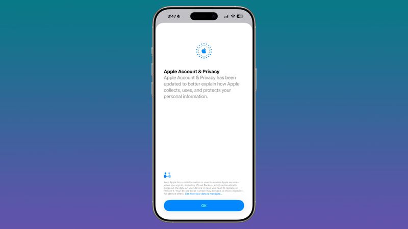 - เห็นการแจ้งเตือนให้ทราบว่าข้อมูลความเป็นส่วนตัวของ Apple สำหรับบัญชี Apple หลังจากติดตั้ง iOS 26.2
