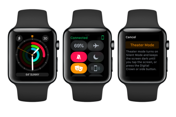 Theater Mode ช่วยให้ผู้ใช้งานสามารถปิดเสียงแจ้งเตือนและไฟหน้าจอจะไม่เปิดเมื่อยกข้อมือขึ้นมาดู แต่ผู้ใช้งานยังคงได้รับการแจ้งเตือนและรับรู้ได้จากการสั่นเตือนเบา ๆ ของ Haptics โดยในขณะเปิดใช้งานฟีเจอร์นี้จำเป็นต้องแตะที่หน้าจอหรือปุ่ม Digital Crown เพื่อเปิดหน้าจอใช้งาน ซึ่งก็เหมือนเป็นการปิดไม่ให้รบกวนผู้อื่นตามชื่อโหมด เหมาะสำหรับใช้งานในโรงหนัง