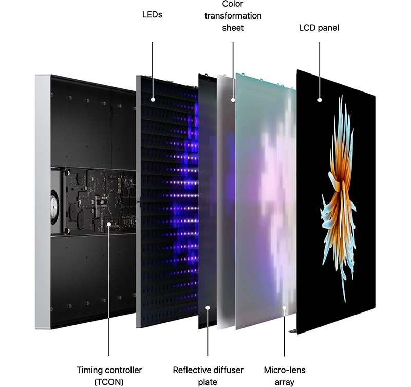 ทั้งนี้ ส่วนของหน้าจอ Pro Display XDR นั้นระบุถึงพาเนลหน้าจอแสดงผลที่ใช้ระบบ LED Backlighting, ความแม่นยำของสี และชิพควบคุมจังหวะเวลา (TCON)