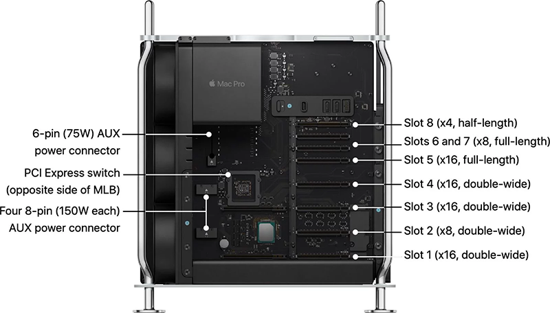 เอกสารของ Mac Pro ระบุว่าตัวเครื่องนั้นมาพร้อมกับเคสแบบตาข่าย, หน่วยประมวลผล Intel Xeon W และ T2 รวมถึง Slot ต่างๆ ที่ใส่ทั้ง GPU, PCIe, MPX, I/O, SSD และอื่นๆ โดย Apple ได้อธิบายถึงดีไซน์ทั้งหมดนี้ทำมาเพื่อ Mac Pro โดยเฉพาะ