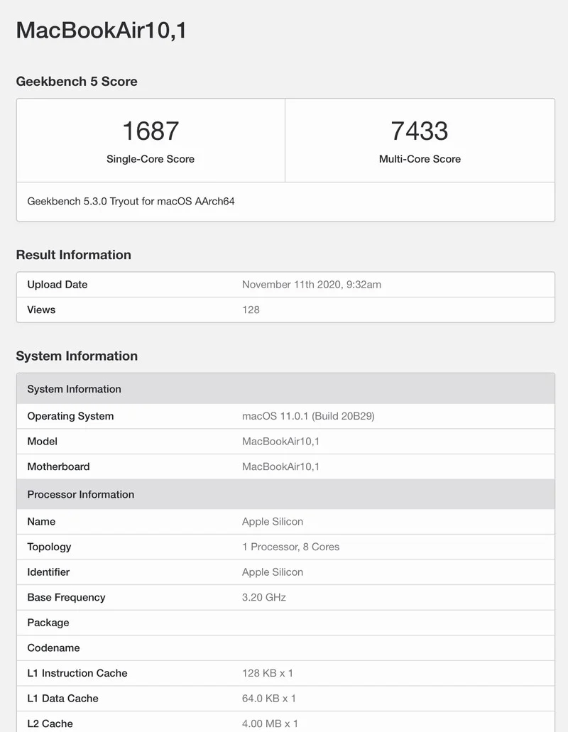 MacBook Air ชิป M1 ความเร็ว 3.2GHz พร้อม RAM 8GB ทำคะแนน Single-core ที่ 1,687 และ Multi-Core ที่ 7,433 ซึ่งนี่เป็นคะแนนที่มากกว่าอุปกรณ์ iOS และ iPadOS ทุกตัว ทั้ง iPhone 12 Pro ที่ทำได้ 1,584 และ 3,898 คะแนนตามลำดับ หรือจะเป็น iPad Air 4 ที่ทำได้ 1,585 และ 4,647 คะแนนตามลำดับ