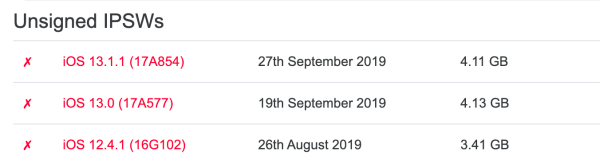 การปิดดาวน์เกรด iOS 13.1.1 (17A854) จะทำให้ไม่สามารถดาวน์เกรดจาก iOS 13.1.2 (17A861) หรือ iOS 13.1 (17A844) ลงมาเพื่อติดตั้ง iOS 13.1.1 ได้แล้ว หากทำการ Restore จะทำให้ติดตั้งไม่ได้เกิด error ระหว่างการติดตั้ง