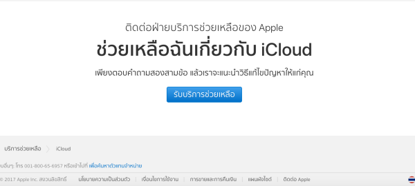 ตัวอย่างปัญหาที่ผู้เขียนพบคือ iCloud ไม่สามารถแบ็คอัพข้อมูลได้ ให้เลือกไปที่ iCloud หลังจากนั้นก็จะมีหัวข้อต่างๆ ให้แก้ปัญหาเบื้องต้น หากดูแล้วไม่สามารถแก้ไขเองได้ ต้องการติดต่อเจ้าหน้าที่ให้เลื่อนหน้าจอลงมาด้านล่างสุดครับ และเลือกไปที่ “รับบริการช่วยเหลือ”