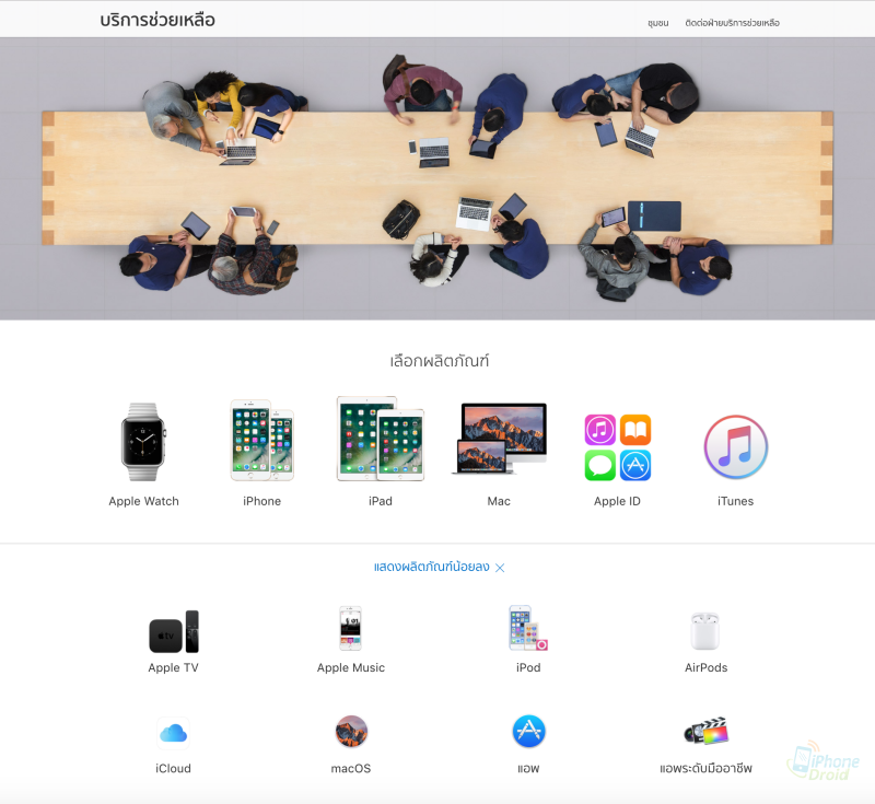 ให้เข้าไปที่หน้าเว็บแอปเปิล www.apple.com และไปที่หัวข้อ “บริการช่วยเหลือ” และเลือกผลิตภัณฑ์ที่พบปัญหาการใช้งาน (ผ่าน browser บนคอม และมือถือ)