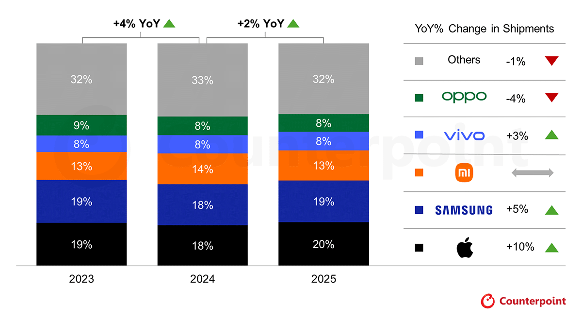 โดย Apple ทำส่วนแบ่งการตลาดได้ 20% เพิ่มขึ้นจากปี 2024 ถึง 10% จากนั้นก็ตามติดด้วย Samsung ในส่วนแบ่ง 19% เพิ่มขึ้นมา 5% ในปี 2024 ส่วนอันดับที่ 3 เป็น Xiaomi ที่ 13% ตามด้วย vivo ที่ 8% และ OPPO ที่ 8%